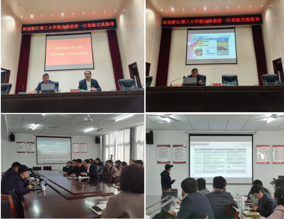 随后的交流座谈在学院315会议室举行。座谈会上,浙江理工大学生命科学与医药学院杨东风教授进一步就“药食同源与产品开发策略”进行了专题分享。他明确指出药食同源研究的核心在于功效物质的阐明,并系统阐述了从物质基础解析、合成与代谢调控到现代技术应用等四个关键研究方向。双方教师就共同关心的科研问题、课程建设、人才培养模式等进行了热烈讨论。学院领导表示,此次高水平的交流活动,为我院与浙江理工大学绍兴生物医药研究院之间搭建了坚实的合作桥梁。未来,学院将以此为契机,进一步强化与该研究院在科研平台共享、项目联合攻关、人才协同培养等方面的深度合作,共同推动我院中药学类学科专业的内涵建设与水平提升。