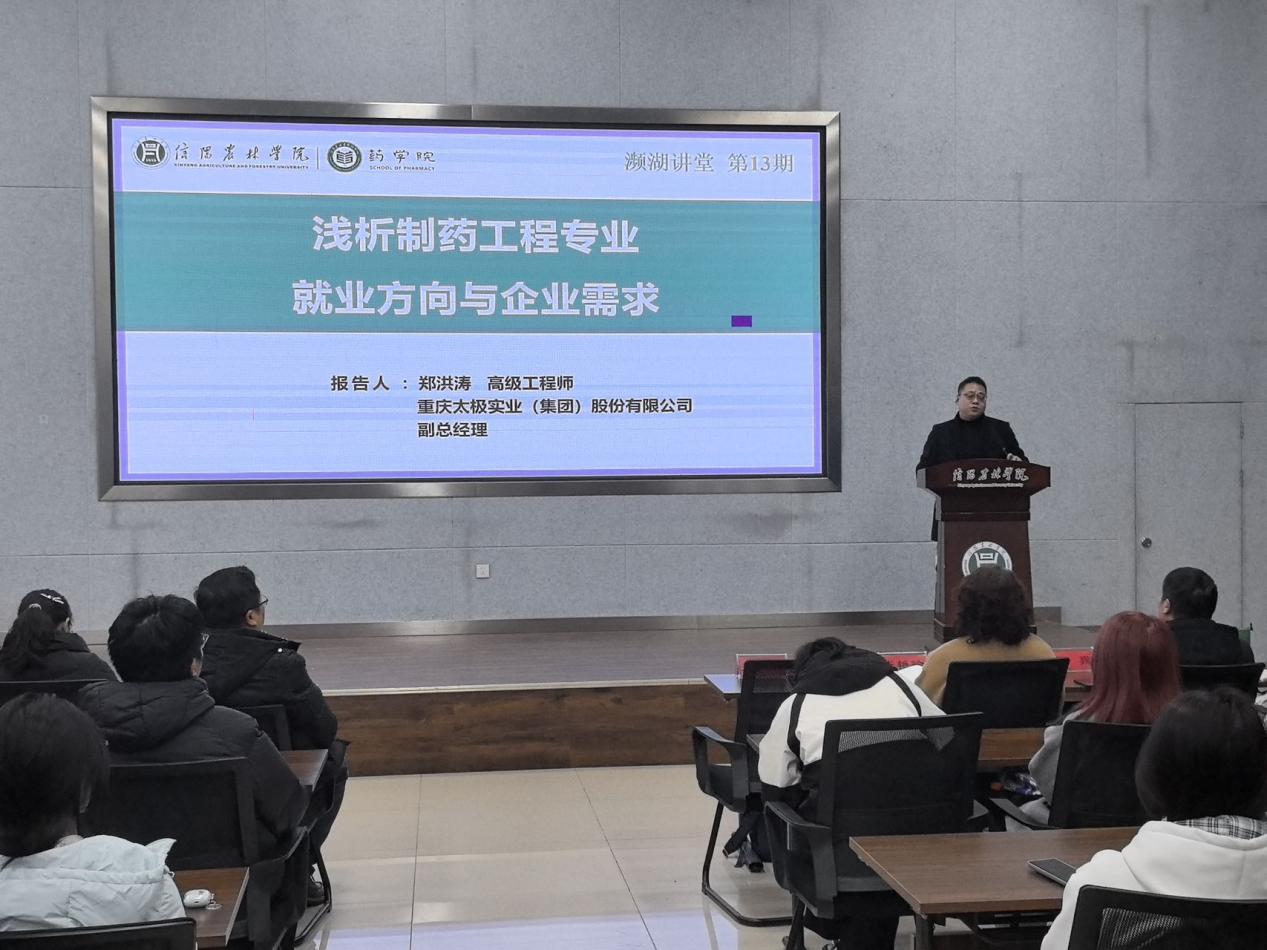 12月19日,药学院于在大学生众创空间多功能厅开展第13期“濒湖讲堂”。药学院副教授张艳玲、汇智工程科技股份有限公司武汉分公司副总经理袁巍及制药工程专业学生共同参会,重庆太极实业(集团)股份有限公司副总经理、高级工程师郑洪涛担任主讲人。