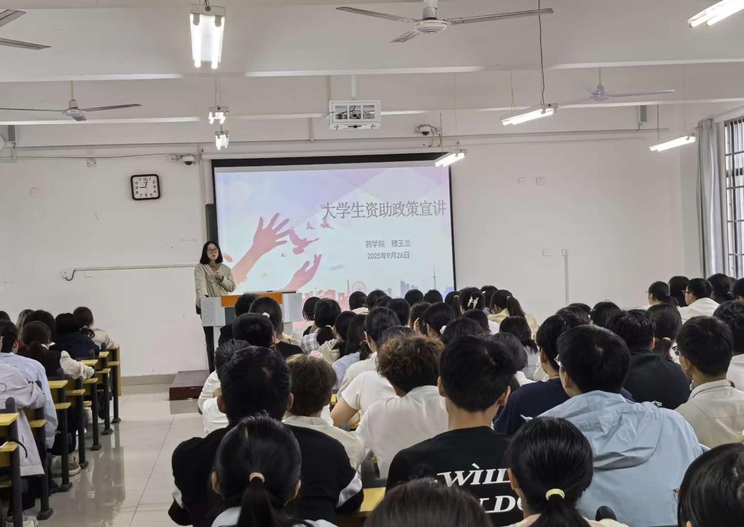 9月28日,药学院在多媒体教室面向2025级新生开展资助政策宣讲活动。本次活动由药学院资助专员穆玉兰主讲,全体2025级新生参加。